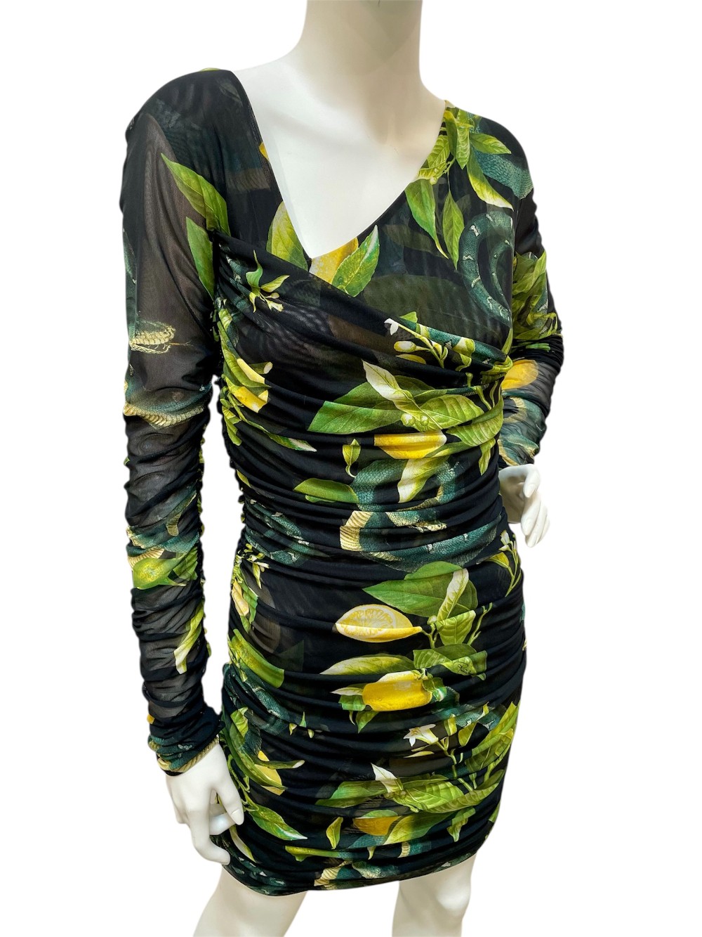This dress has very flattering ruching on throughout the body and sleeves, and features a leafy lemon print.